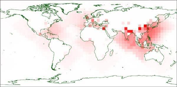 Những vị trí va chạm của tiểu hành tinh sẽ gây ra thương vong nhiều nhất (Màu đỏ càng đậm, thương vong càng nhiều)