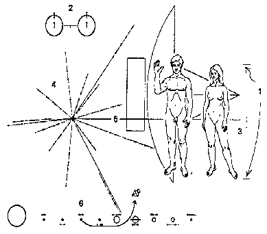 Hình: tấm kim loại mà hai con tàu Pioneer mang theo trong chuyến thám hiểm của mình. Bên phải là hình vẽ hai con người - một đàn ông, một đàn bà. Bên trái họ là bản đồ chỉ dẫn vị trí của Mặt Trời bên cạnh sao pulsa gần nhất và trung tâm Ngân Hà. Phía dưới cùng là hình vẽ tượng trưng vị trí xuất phát và hành trình của hai con tàu Pioneer trong hệ Mặt Trời. Phía trên bên trái là mô hình miêu tả hai trạng thái cơ bản của nguyên tử hiđro. Tấm kim loại trên được thiết kế bởi một ủy ban do Carl Sagan (ĐH Cornell) lãnh đạo.