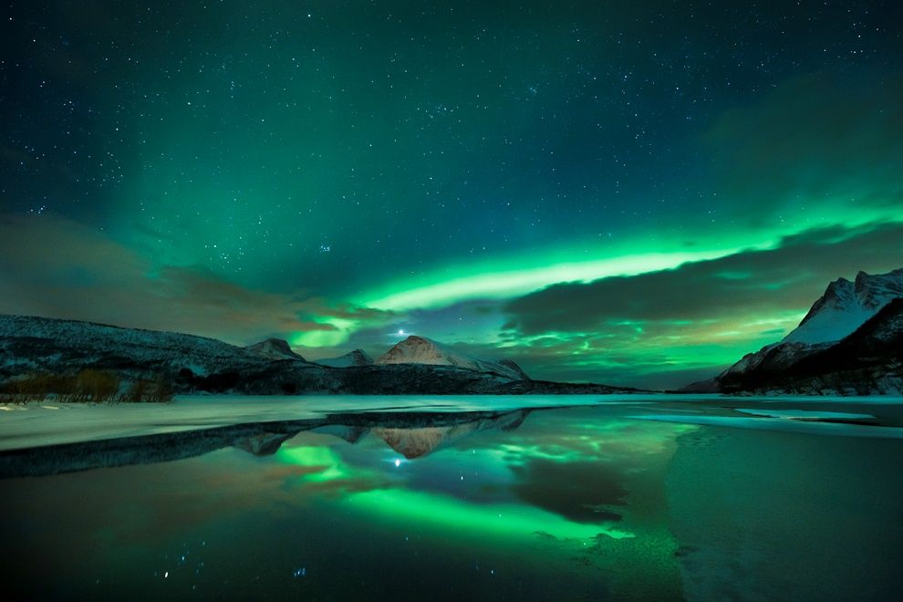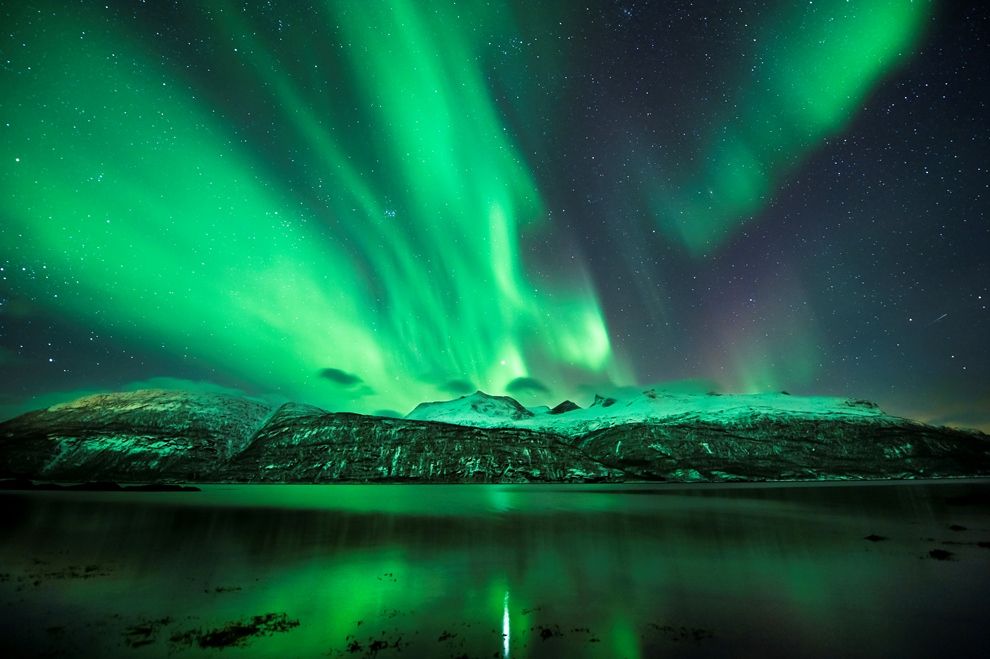 Ánh trăng soi sáng những dãy núi bị phủ bởi tuyết gần làng Ersfjord ở phía bắc Na Uy.