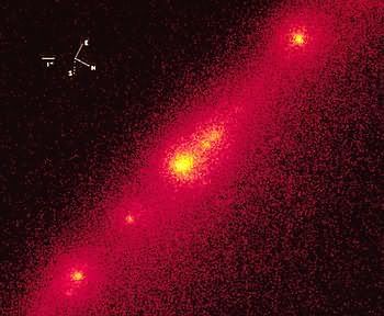 Dải sắc màu này giống như làm khói bay lên sau buổi trình diễn pháo hoa. Thực ra đây là những gì còn lại sau một vụ nổ ở một thiên hà gần đó (còn gọi là sao băng).