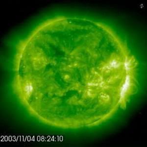 Những tia lửa cực lớn đang phun trào được quan sat vào ngày 4 tháng 11 năm 2003. Hình ảnh này được lấy từ đoạn video quay bởi SOHO.