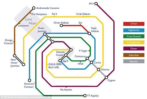 Hoàn toàn dựa trên cơ sở của bản đồ tàu điện ngầm, một nhà khoa học đã công bố bản đồ giao thông của dãy ngân hà. Bản đồ này thể hiện mối quan hệ rộng lớn và phức tạp dãy Ngân hà của chúng ta trong một lộ trình giao thông.