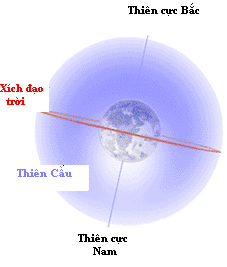 - Mặt phẳng đi qua người quan sát và vuông góc với trục vũ trụ sẽ cắt thiên cầu theo một đường tròn. Nó được gọi là Xích đạo trời. Xích đạo trời chia thiên cầu thành 2 phần: bán cầu Bắc và bán cầu Nam.