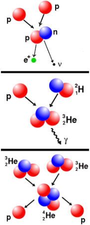 Sau Big Bang, vũ trụ tiếp tục giãn nở. Tuy nhiên do mật độ vật chất (lúc này chủ yếu chỉ có H, He và 1 ít ko đáng kể Li) ko đồng đều, do đó sự giãn nở cũng ko đồng đều. Nơi nào mật độ vật chất càng cao thì dưới tác dụng của lực hấp dẫn (gravitional force), sự giãn nở diễn ra càng chậm. Chính những vùng có mật độ cao này có xu hướng co lại dưới tác dụng của lực hấp dẫn, tạo thành những vùng tạm gọi là island. Trong chính các island này vật chất cũng phân bố ko đồng đều, các vùng có density cao ngưng tụ lại thành các mini-island. Khi ngưng tụ như vậy, nhiệt độ lại bắt đầu cao lên và đến một lúc nào đó ở tâm của các mini-island này xảy ra các phản ứng nhiệt hạch: H refuse tạo thành He theo chu trình sau gọi là proton - proton chain (PP chain)